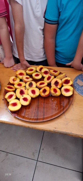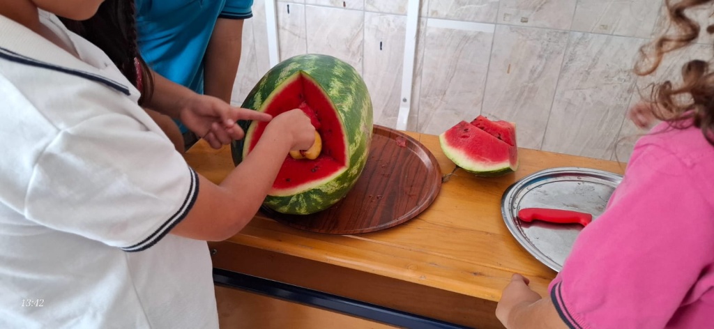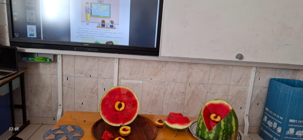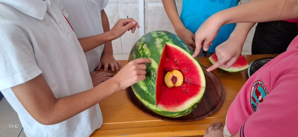 Uygulama: Öğrenciler yardımla karpuzu ve şeftaliyi kesti. Şeftaliyi karpuzun içine yerleştirdi.